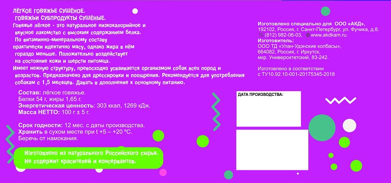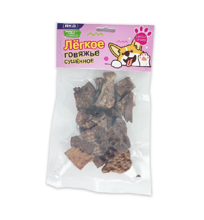 Сушеное говяжье лёгкое относится к диетическим лакомствам. Продукт рекомендуется собакам в возрасте от 1,5 месяцев, в том числе страдающим ожирением и обладающих деликатным пищеварением, а также находящимся на реабилитации после болезней. Легкое практически не уступает мясу по витаминно-минеральному составу, но при этом содержит минимум жиров. Регулярное употребление продукта улучшает работу сердца и сосудов, положительно сказывается на состоянии кожи и шерсти. Подходит для дрессуры и поощрения, может использоваться самостоятельно или как компонент комплексного рациона.