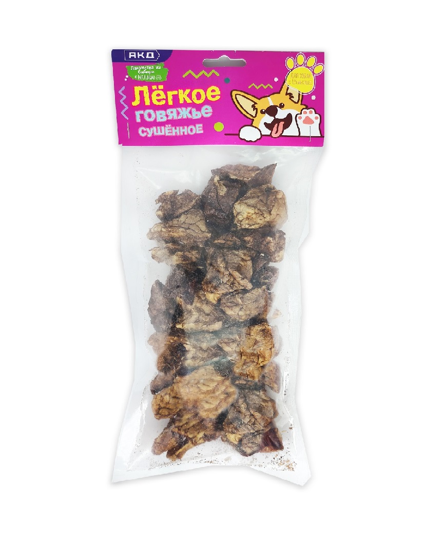 Сушеное говяжье лёгкое относится к диетическим лакомствам. Продукт рекомендуется собакам в возрасте от 1,5 месяцев, в том числе страдающим ожирением и обладающих деликатным пищеварением, а также находящимся на реабилитации после болезней. Легкое практически не уступает мясу по витаминно-минеральному составу, но при этом содержит минимум жиров. Регулярное употребление продукта улучшает работу сердца и сосудов, положительно сказывается на состоянии кожи и шерсти. Подходит для дрессуры и поощрения, может использоваться самостоятельно или как компонент комплексного рациона.