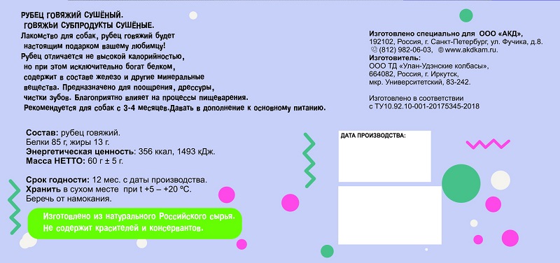 Сушёный говяжий рубец – низкоуглеводный продукт, богатый белками и жирами. Его регулярное употребление укрепляет мышцы животного, нормализует пищеварение и в целом благоприятно влияет на организм. Лакомство также отлично очищает зубы собаки. Продукт содержит комплекс водорастворимых витаминов группы В, жирорастворимый витамин E, железо и другие минералы. Рубец рекомендован для поощрения и дрессуры собак в возрасте от 3-4 месяцев, его можно использовать самостоятельно и в дополнение к другой пище.