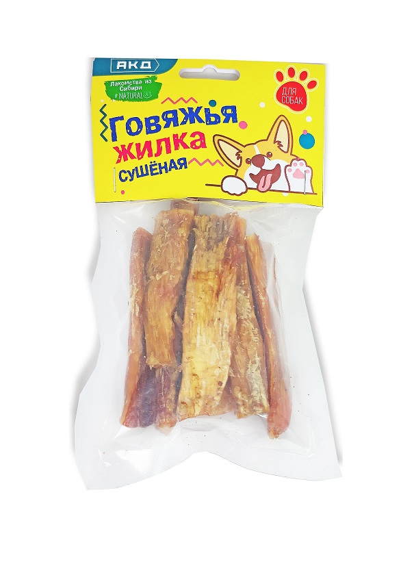 Сушёная говяжья жилка – натуральное собачье лакомство, важный источник целого ряда полезных веществ. Продукт содержит витамины, минералы, незаменимые аминокислоты, необходимые для нормального развития животного. Жилки являются отличным тренажером для челюстей и десен, а также средством для очистки зубов от налета. Рекомендуется к применению собаками мелких и средних пород для дрессуры и поощрения.
