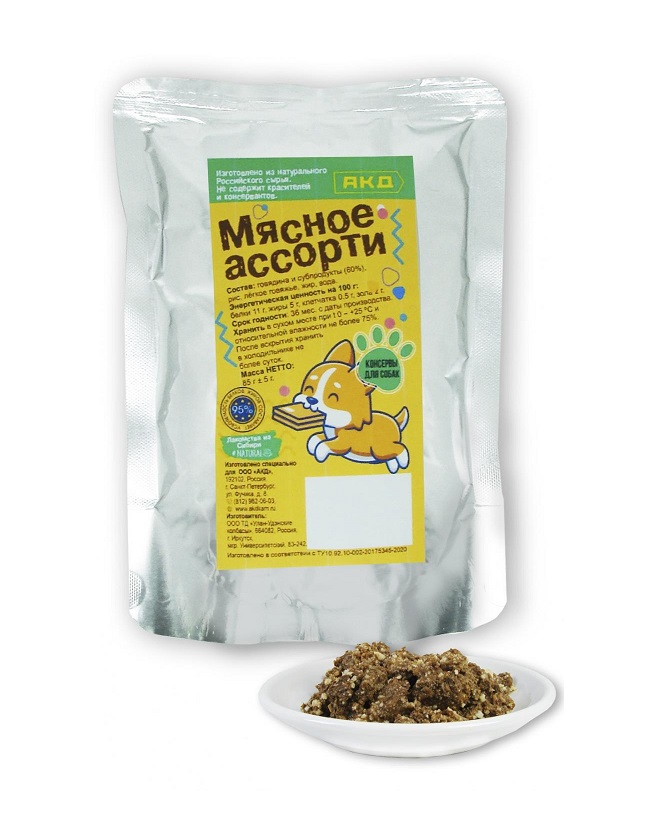 Ассорти содержит витамины групп В2, РР. Высококачественный сбалансированный корм, приготовленный из отборных ингредиентов, является отличным источником железа и фосфора, которые отвечают за энергетический баланс и выработку гемоглобина, также служат для укрепления костей и суставов. Не содержит сои, консервантов, искусственных красителей и усилителей вкуса. Подходит для собак всех пород.