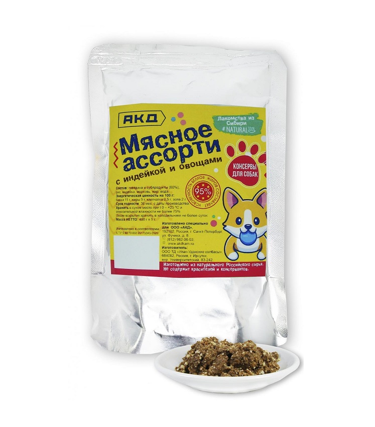 Индейка с овощами — мясное диетическое лакомство которое легко усваивается, содержит мало жиров и калорий. Мясное ассорти с индейкой содержит важные для здоровья животного и сильного иммунитета микроэлементы: железо, фосфор, натрий, кальций, калий, магний и богато витаминами групп А, B, E, нормализующие обмен веществ, которых в птице больше, чем в говядине. Высококачественный сбалансированный корм приготовлен из отборных ингредиентов, благодаря которым поддерживает иммунитет, рост костей, здоровье мышц, придает здоровье коже, красоту и блеск шерсти. Не содержит сои, консервантов, искусственных красителей и усилителей вкуса. Подходит для собак всех пород.