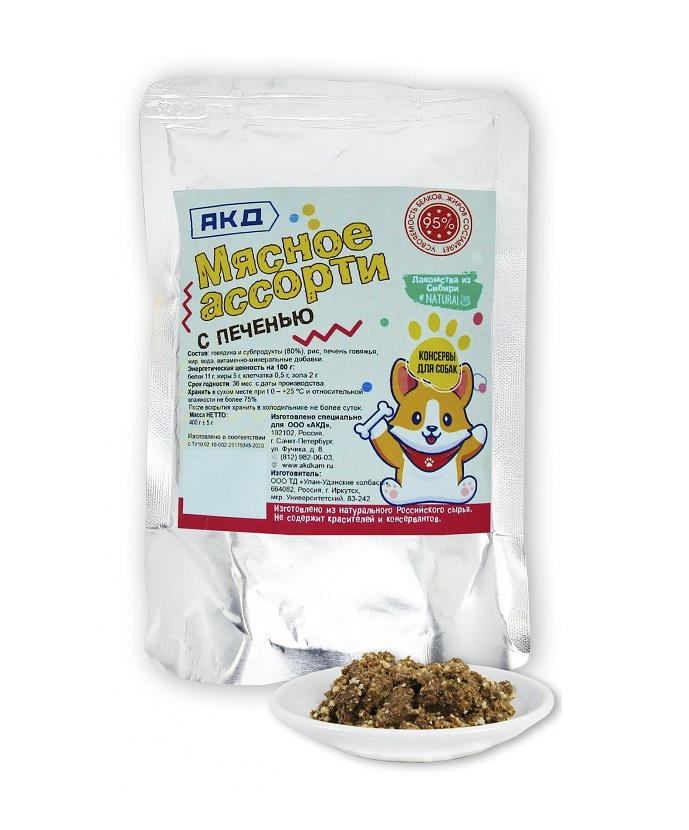 Деликатесное мясное лакомство высокого класса. Мясное ассорти с печенью — полезный и легкоусвояемый продукт. Ассорти с печенью содержит большое количество витаминов групп A, В1, В2, В3, С, Н, РР; много железа, цинка и меди, также полезные аминокислоты. Высококачественный сбалансированный корм приготовлен из отборных ингредиентов, которые важны для здоровья животного и благодаря которым поддерживается иммунитет, рост костей, здоровье мышц, здоровье кожи, красота и блеск шерсти. Не содержит сои, консервантов, искусственных красителей и усилителей вкуса. Подходит для собак всех пород.
