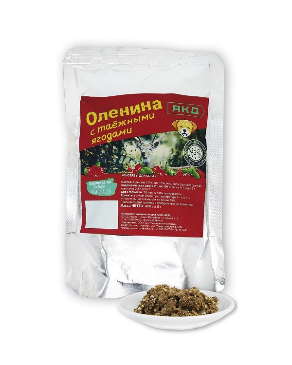 Состав: Оленина (70%), рис (10%), жир, вода, брусника сушеная.
