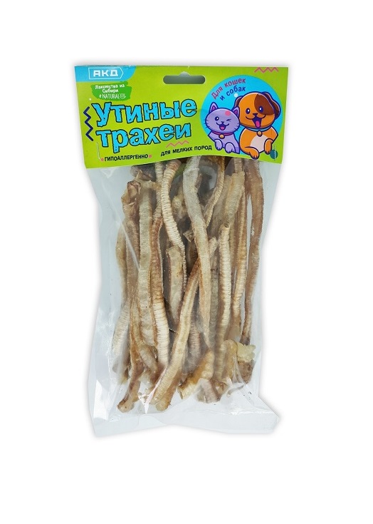 Сушеные утиные трахеи – вкусное хрустящее лакомство для собак мелких пород (используется при дрессуре и для поощрения). Это богатый источник хрящевой и соединительной ткани, сбалансированного комплекса аминокислот, а также минералов (магний, кальций, железо и другие) и витаминов. Регулярное употребление продукта укрепляет иммунитет животного, нормализирует работу сердечно-сосудистой системы, стимулирует пищеварение. Лакомство особенно полезно щенкам в период роста, кормящим и беременным самкам. Утятина гипоаллергенна, ее можно предлагать собакам, склонным к аллергии и имеющим чувствительное пищеварение.